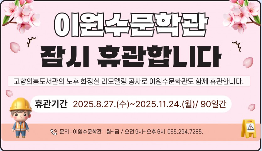 이원수문학관 휴관 안내 페이지 정보 작성자 관리자 댓글 0건 조회 278회 작성일 25-08-23 09:34 본문 이원수문학관 휴관 안내 목록 이전글2025 창원남산상봉제 체험프로그램 자원봉사와 관련해 25.09.30 다음글2025 문학상주작가 지원사업 동화창작교실 '글창고' 출판기념회 개최 및 작품집 전시 25.08.23