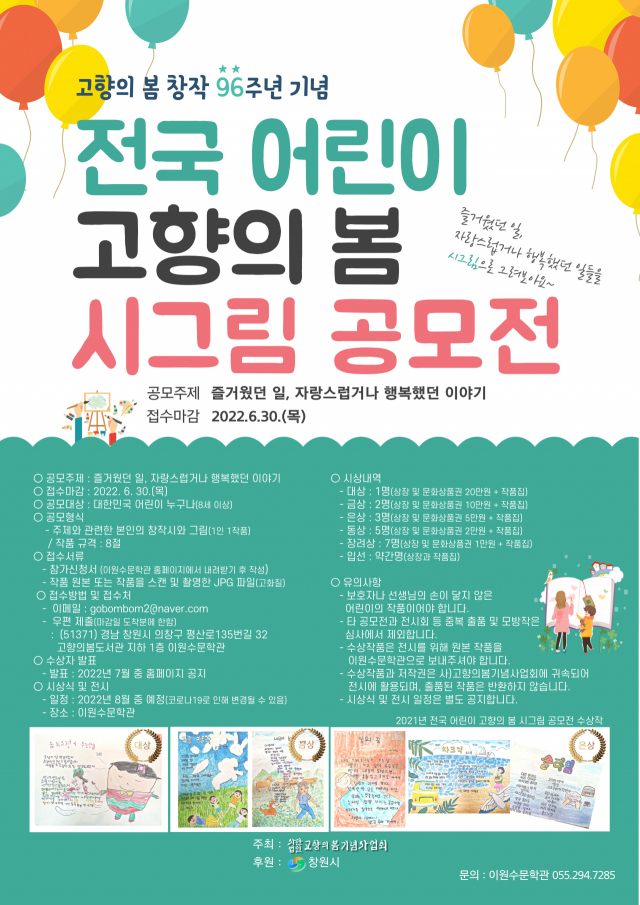 (사)고향의봄기념사업회는 ‘고향의 봄’ 창작 96주년을 기념해 ‘2022 전국 어린이 고향의 봄 시그림 공모전’을 개최한다.